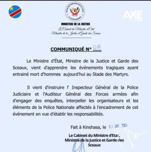 De son côté, ayant appris ces événements tragiques qui a entraîné mort d’hommes au Stade des Martyrs, le Ministre d’Etat, Ministre de la Justice et garde des sceaux Maître Constant Mutamba a instruit le même Samedi dans la soirée l’inspecteur Général de la police Judiciaire et l’Auditeur Général des Forces armées, afin d’engager des enquêtes, interpeller les organisateurs et les éléments de la Police Nationale affectés à l’encadrement de cet événement, en vue d’établir les responsabilités.