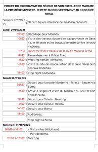 Après une pause déjeuner à l’hôtel Théo, la Première Ministre tiendra un meeting populaire sur le terrain du Territoire avant de visiter le site de relocalisation de la Base navale de Banana à Kindofula. Elle passera la nuit à Muanda avant de poursuivre son itinéraire vers d’autres Territoire du Kongo Central.