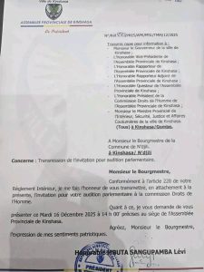 Le Collectif des Bourgmestres s’interroge également sur la base légale d’une telle démarche. Il rappelle que le Règlement intérieur de l’Assemblée Provinciale de Kinshasa ne s’applique qu’aux députés provinciaux, membres de cette institution, et ne saurait en aucun cas être opposable aux Bourgmestres, lesquels relèvent de l’exécutif local.