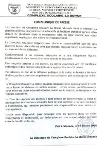 La Direction du Complexe Scolaire La Borne, à Muanda, a publié un communiqué de presse daté du 19 février 2026 pour réagir à la circulation d’une vidéo montrant une scène regrettable impliquant certains élèves de l’établissement entrain de tabasser leur collègue.